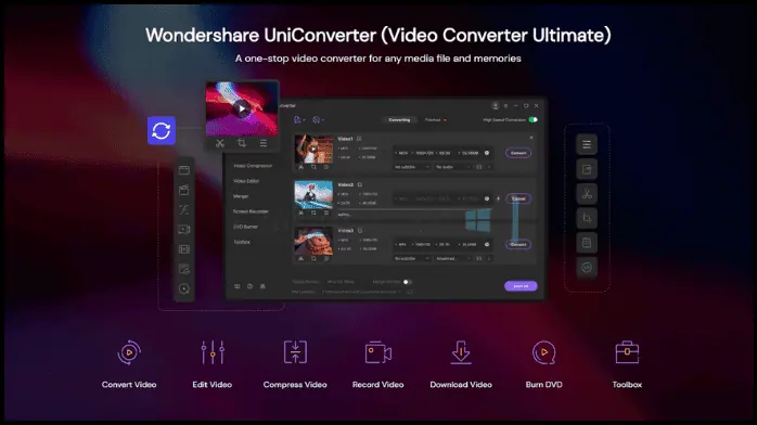 إذا كنت تستخدم تحميل برنامج Wondershare UniConverter الكامل، فستحصل على نتائج رائعة وسرعات تحويل سريعة جدًا. وهذا يجعله خيارًا رائعًا للاستخدام الشخصي والتجاري. يتيح البرنامج للمستخدم تحرير وتغيير أي مقاطع فيديو على جهازه. على سبيل المثال، يمكنه قص المقطع، أو تكبيره أو تصغيره، أو قلبه، أو تدويره. ليس هذا فحسب، بل إنه يحتوي أيضًا على أدوات لتنزيل الملفات وتغيير الأشكال.